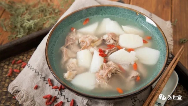 淮山片清水浸透与羊肉一起置于锅中